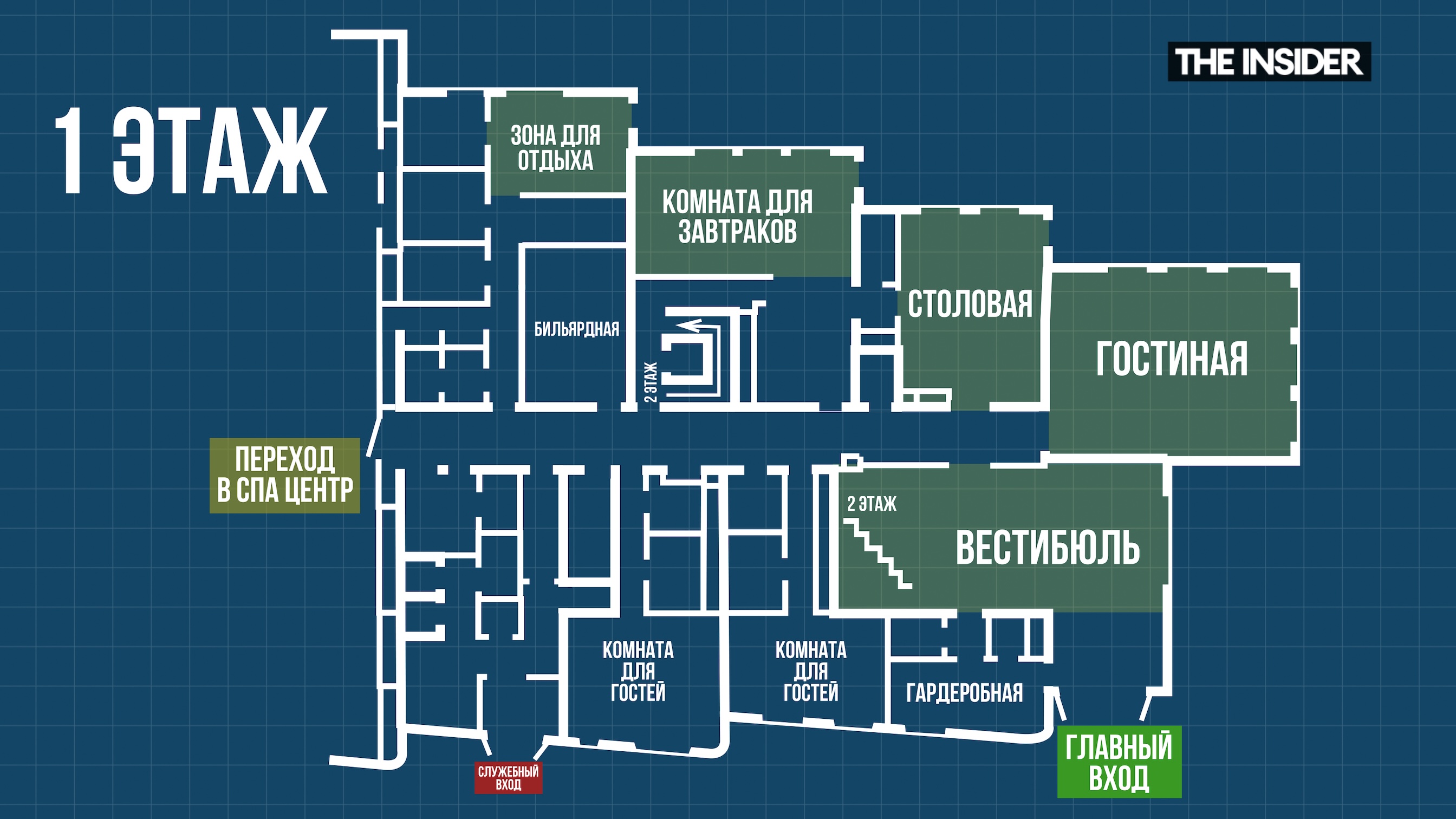 Главная спальня площадью 75 кв. м находится на втором этаже, куда можно попасть по шикарной винтовой лестнице. Рядом со спальней располагаются две гардеробные для Костина и Аскер-Заде и две отдельные хозяйские туалетные комнаты. Также тут есть двухметровое помещение под названием «хранилище украшений» и кабинет хозяина. На втором этаже находятся и две детские комнаты, два детских кабинета и отдельно — игровая комната. Над бассейном расположен спортзал площадью почти в 170 кв. м.
