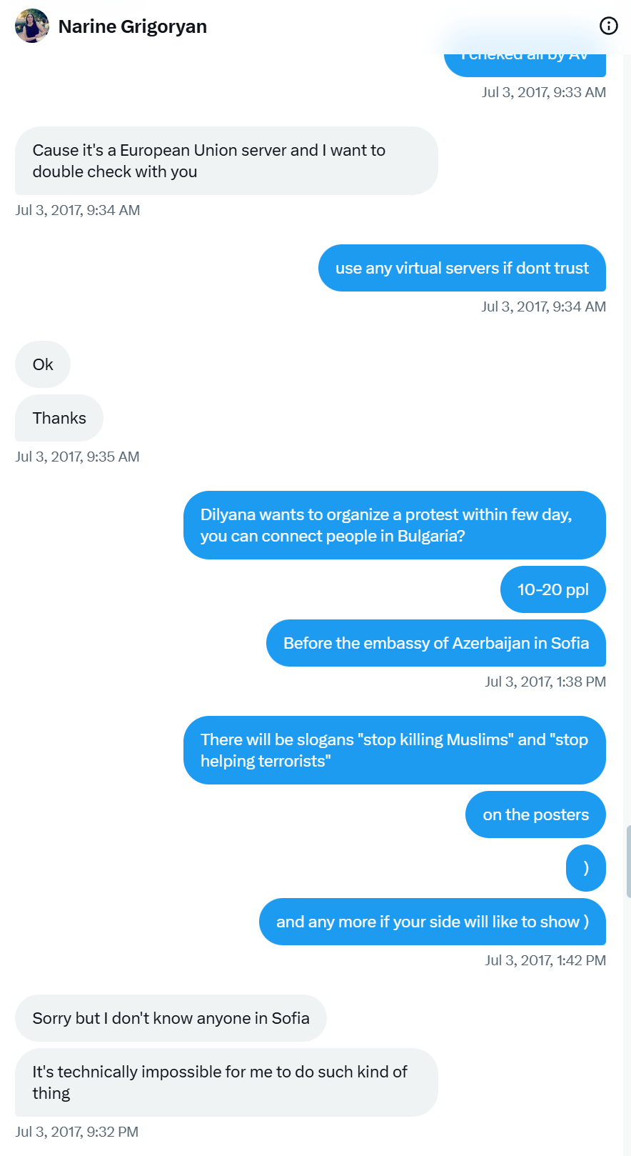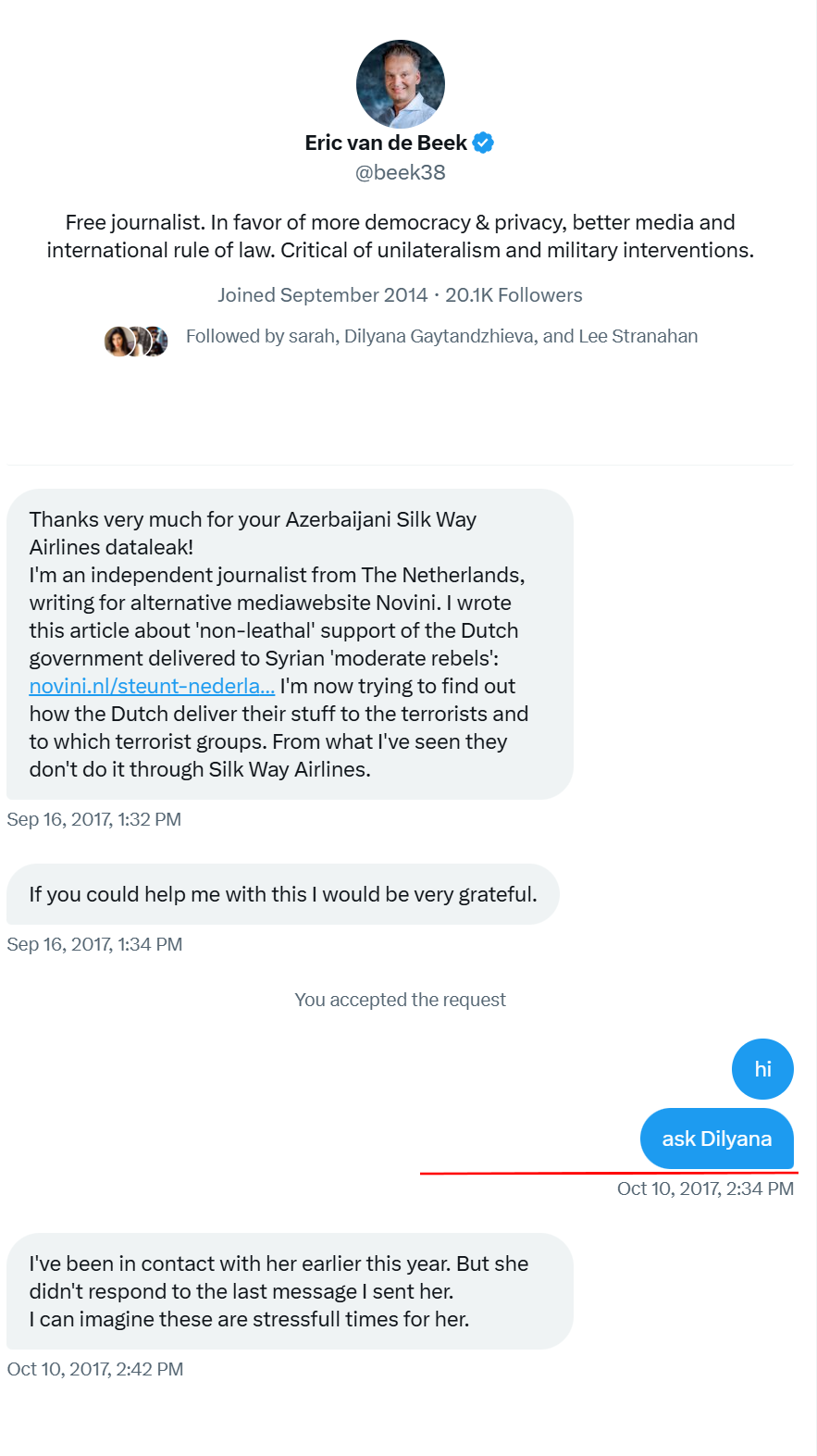 Стигалу также удалось привлечь к распространению информации болгарскую журналистку Диляну Гайтанджиеву. Для легитимации вброса информации он в 2017 году создал Twitter-аккаунт Anonymous Bulgaria, через который слил взломанную переписку посольства Азербайджана. Он якобы «знакомится» с Диляной в твиттере, но судя по тому, что он сразу начинает перенаправлять других журналистов и блогеров к Диляне, утверждая, что она «хорошая девочка», очевидно, что к тому моменту у них уже была предварительная договоренность и устойчивые отношения доверия.