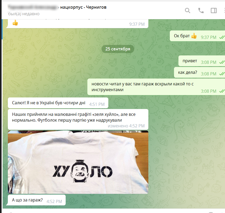 Есть на сервере папка «Работа с нацистами», она содержит только один скриншот чата якобы с высокопоставленным членом «Азова» в Чернигове. В чате собеседники координируют печать футболок с теми же оскорблениями в адрес Зеленского, что и в «граффити». The Insider не разглашает имя собеседника, который сейчас служит в ВСУ, поскольку, судя по всему, он не знал, что сотрудничает с российской разведкой (Стигал общался от лица проукраинского чеченского сепаратиста Ахмета Закаева)