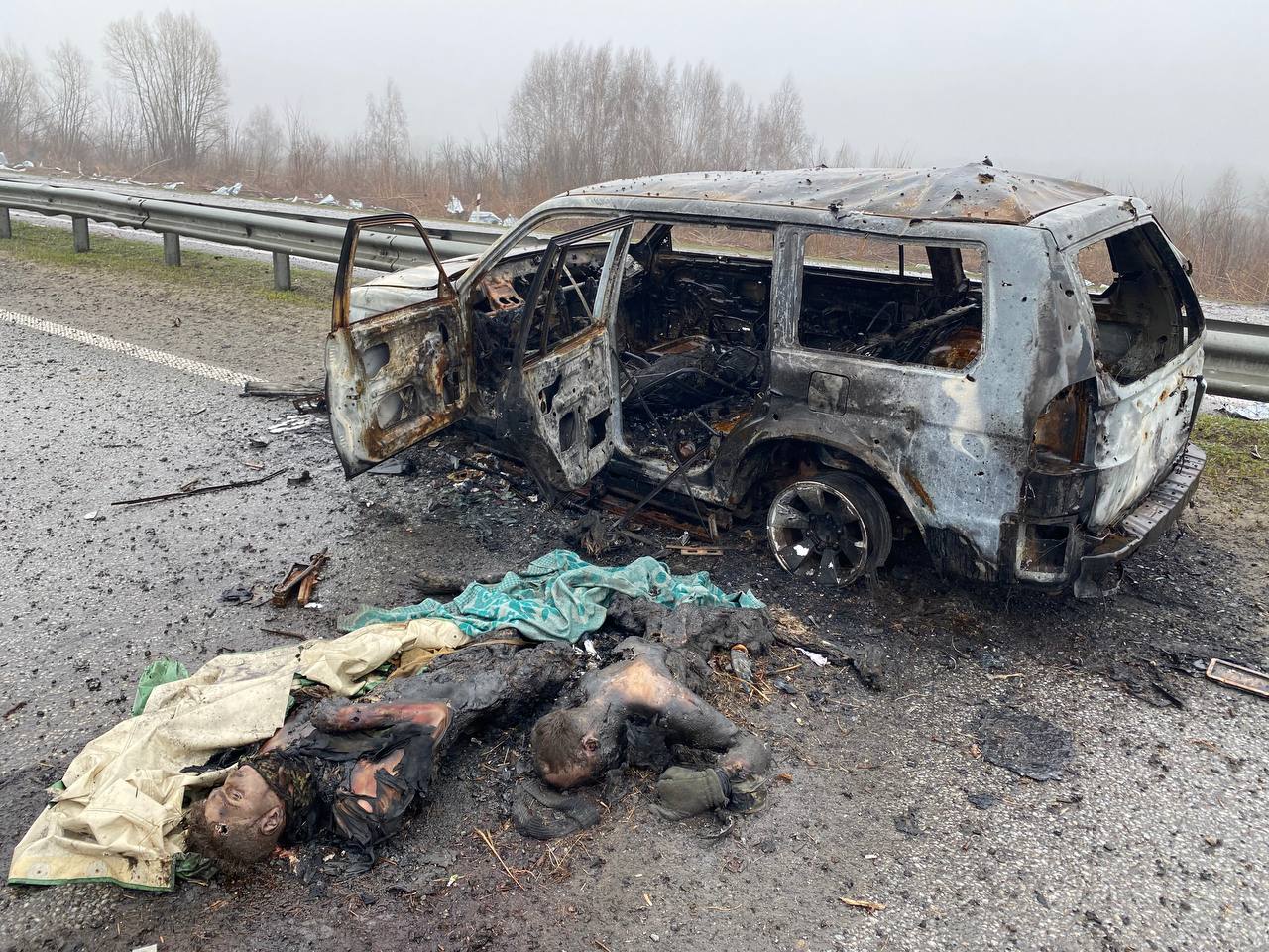 Фотограф Михаил Палинчак сообщил, что в 20 км от Киева обнаружили тела трех человек: мужчину и двух обнаженных женщин. По словам Палинчака, их хотели сжечь на обочине. По данным Минобороны Украины, найдено «4-5 трупов обнаженных женщин», которые «пытались сжечь российские варвары».