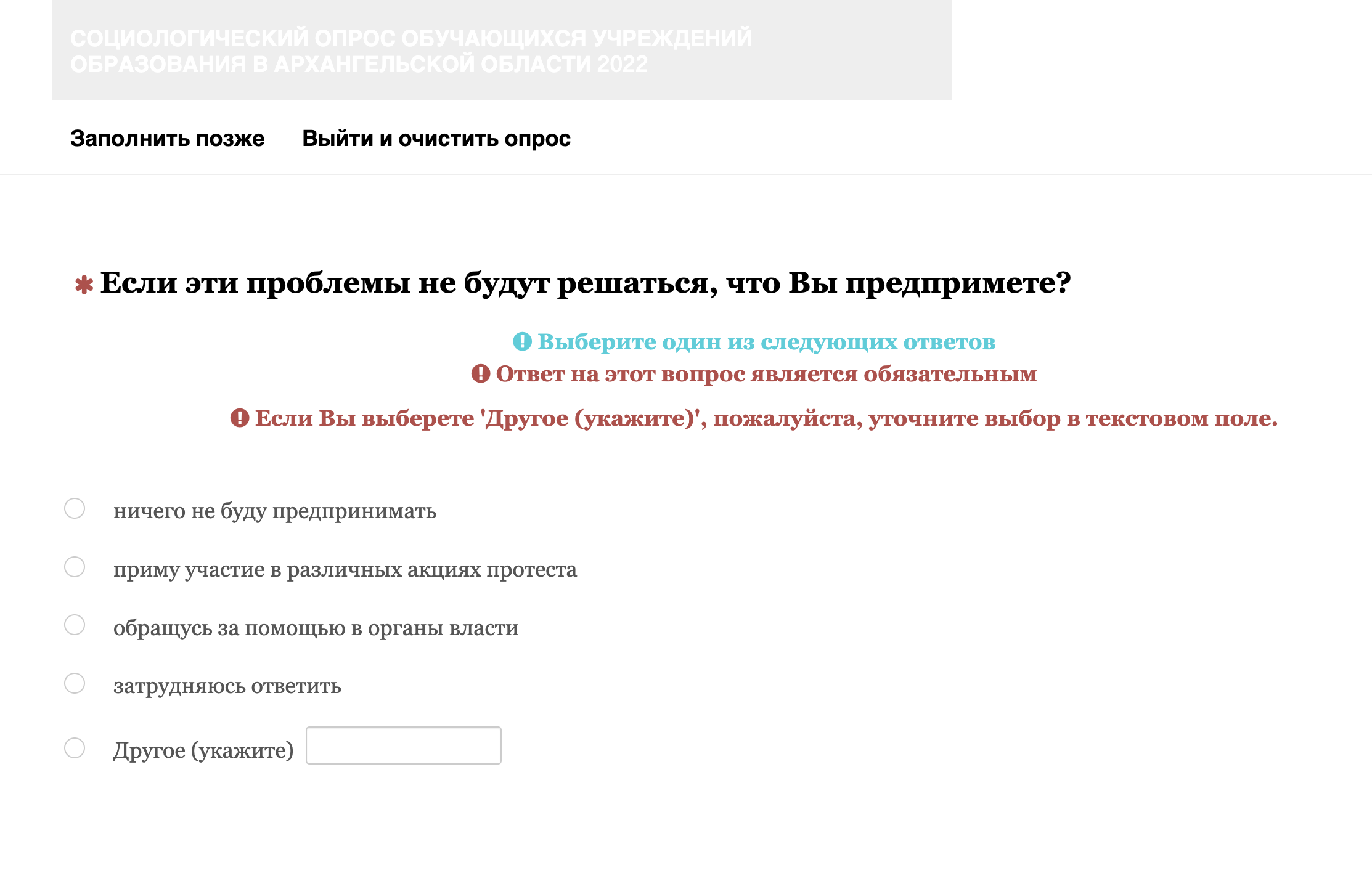 Помимо прочего, у школьников поинтересовались, как они относятся к деятельности губернатора Архангельской области Александра Цыбульского, какие проблемы в области они считают наиболее значимыми и что они планируют предпринимать, если эти проблемы не будут решаться. Также там есть вопросы о том, удовлетворены ли ученики своей жизнью, что они думают об экстремизме и как относятся к людям разных национальностей и других религий.
