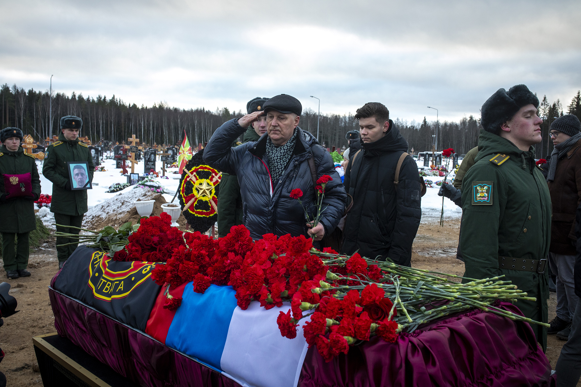 На кладбище приехал основатель ЧВК Вагнера, «повар» Путина Евгений Пригожин. Он появился за два часа до церемонии, поговорил с журналистами государственных СМИ и с сотрудниками РИА «ФАН», издания, которое связывают с самим Пригожиным. После общения с собравшимися основатель ЧВК Вагнера покинул кладбище, не дожидаясь погребения.