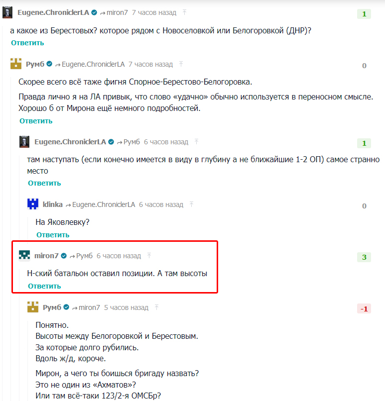 Сообщается об оставлении российским батальоном высот у села Берестовое близ Бахмута. Пользователи пророссийского форума Lostarmour отмечают здесь удачное наступление ВСУ.