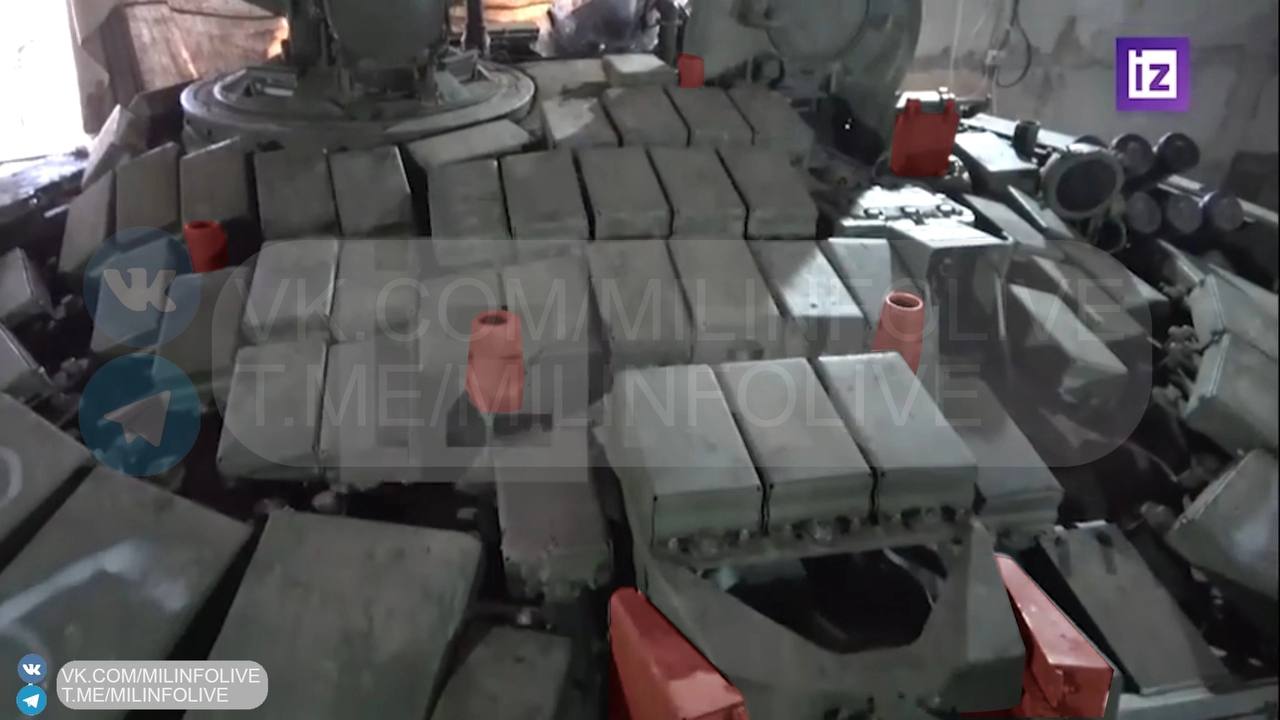 На башни российских танков стали устанавливливать «козырьки» одного вида. Сверху, вероятно, находятся элементы динамической защиты, также есть две откидные сетчатые створки над наводчиком и командиром.