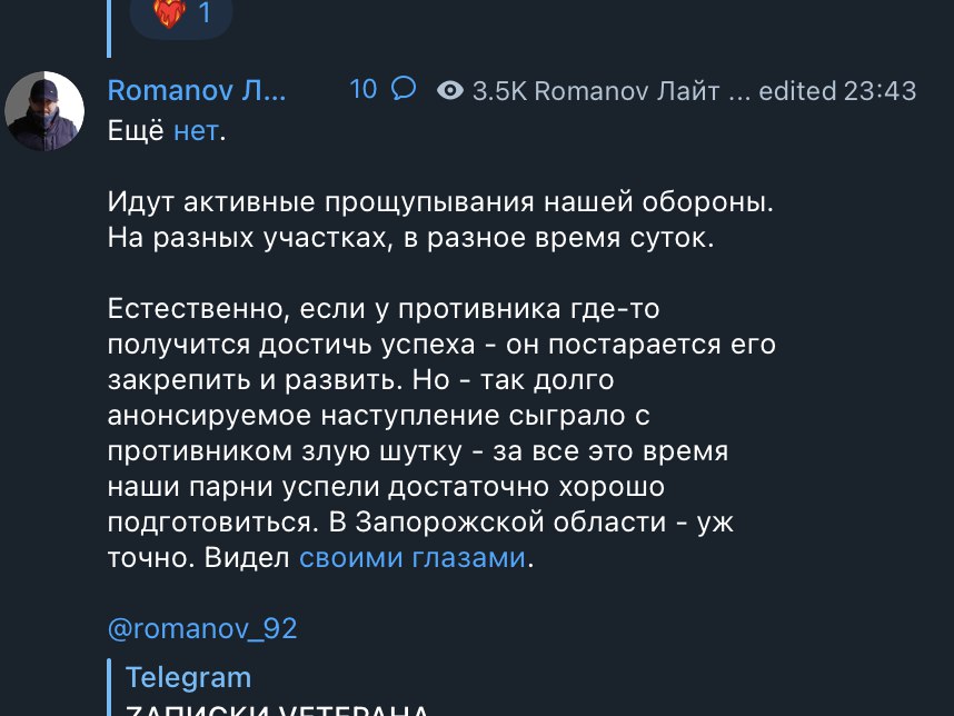 «Ночью на наши позиции было сильнейшее давление со стороны противника на Ореховском направлении. Враг накатывал волнами. Как минимум две атаки были отбиты нашими военными. Невиданное до этого. <...> Врагу удалось занять несколько высот, но в целом глубокого прорыва за эту ночь не получилось. Очевидцы пишут оттуда, что противник бросает в бой подразделение за подразделением. Много техники. Наша авиация работает в карусель. Много уничтожили. Идет настоящая жатва», — сообщает Z-канал «Zаписки Vетерана». Пропагандисты пишут, что таким образом ВСУ пытаются отрезать сухопутный коридор в Крым.