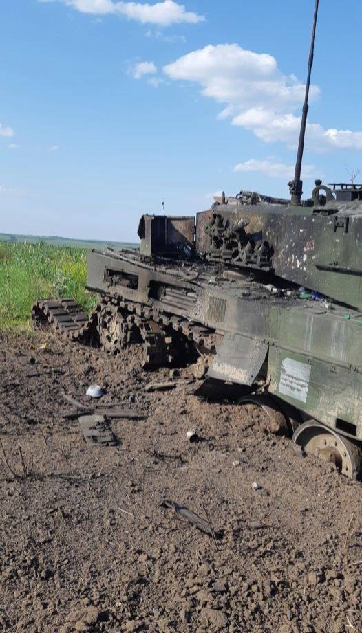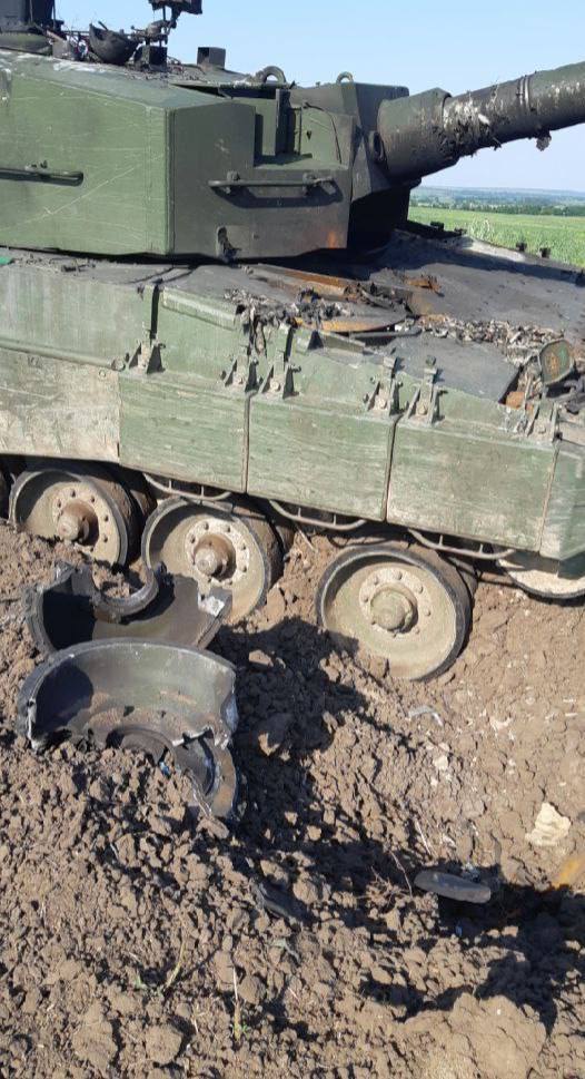 Публикуются фото потерянного ВСУ в Запорожской области немецкого танка Leopard 2A4. Он подорвался на мине, после чего был поражен из РПГ, а также с помощью барражирующего боеприпаса «Ланцет». Российские Telegram-каналы отмечают, что даже этого было недостаточно для того, чтобы уничтожить его полностью.