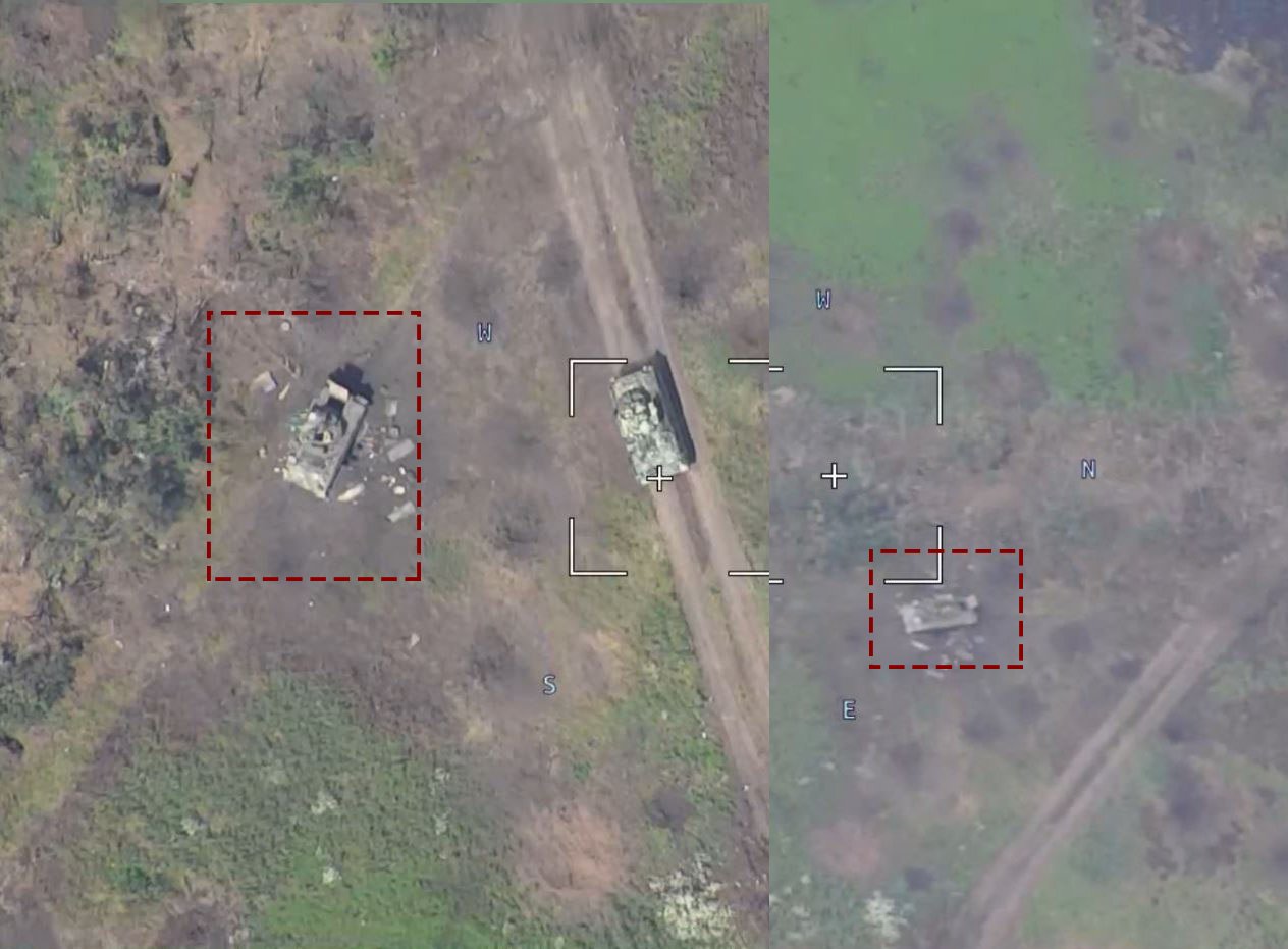 Появилось фотографии и видео одной уничтоженной и трех поврежденных украинских БМП M2A2 Bradley ODS-SA восточнее Работино.