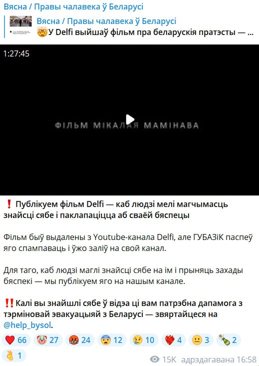 Людям, которые нашли себя в фильме, мы советуем позаботиться о своей безопасности: помимо прочего, они могут обратиться за юридической помощью и консультацией к нашим юристам, а при необходимости экстренного выезда из Беларуси — в фонд BYSOL».