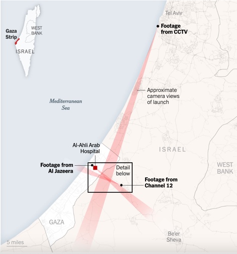 Согласно анализу NYT, ракету с видео выпустили из израильского кибуца Нахаль Оз в сторону Газы, но она взорвалась в небе примерно в 3,2 км от больницы «Аль-Ахли».
