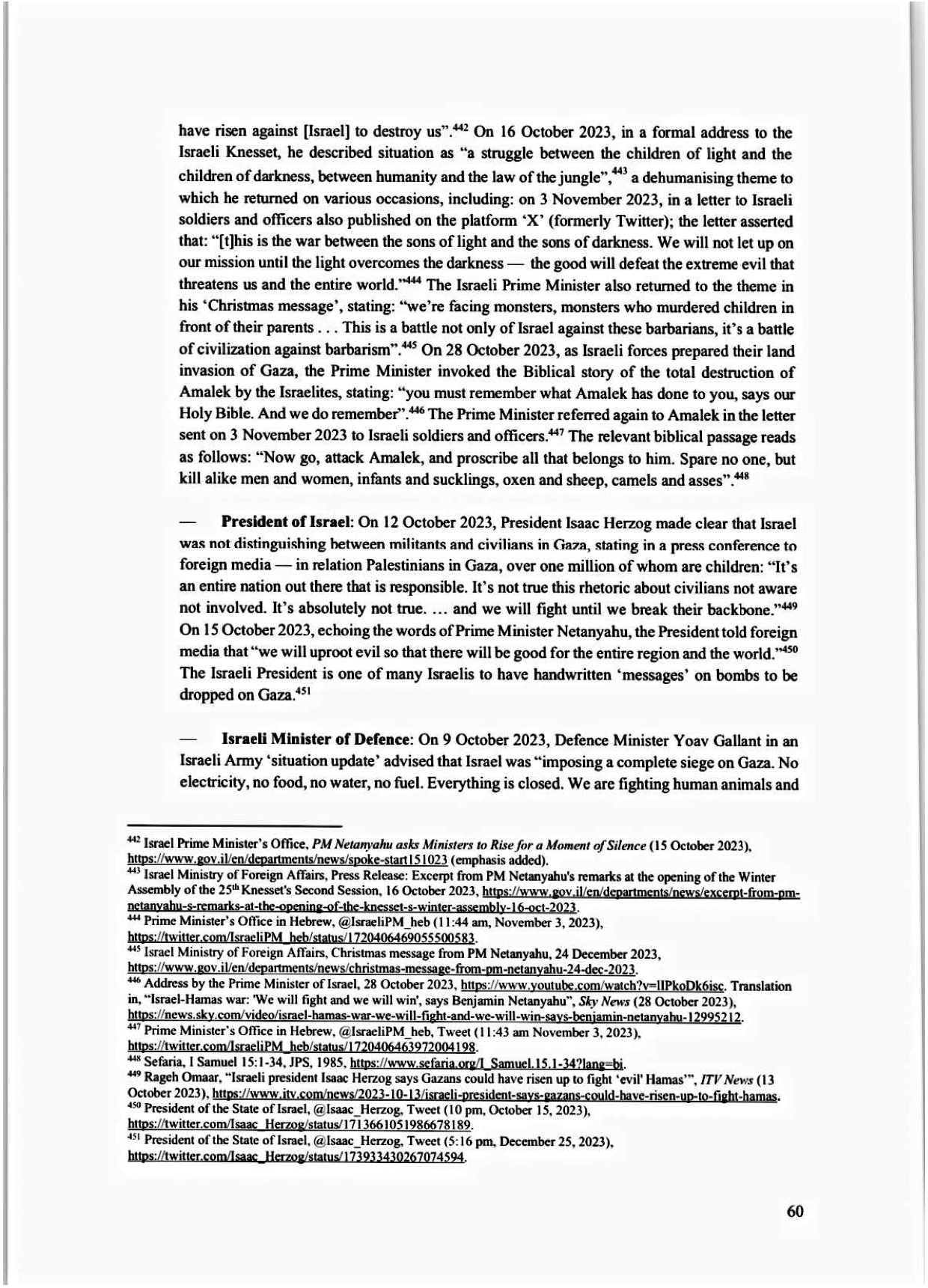 В тексте иска, поданного против Израиля, в качестве доказательства геноцидарных намерений приводятся цитаты израильских политиков. В частности, премьер-министр Биньямин Нетаньяху в конце октября, когда готовилось наземное вторжение в сектор Газа, использовал в своей речи отсылку к образу Амалека как извечного врага Израиля. Нетаньяху процитировал указание из Торы: «Помни, что сделал тебе Амалек» (Дварим, 25:17–19), и добавил: «Мы помним».