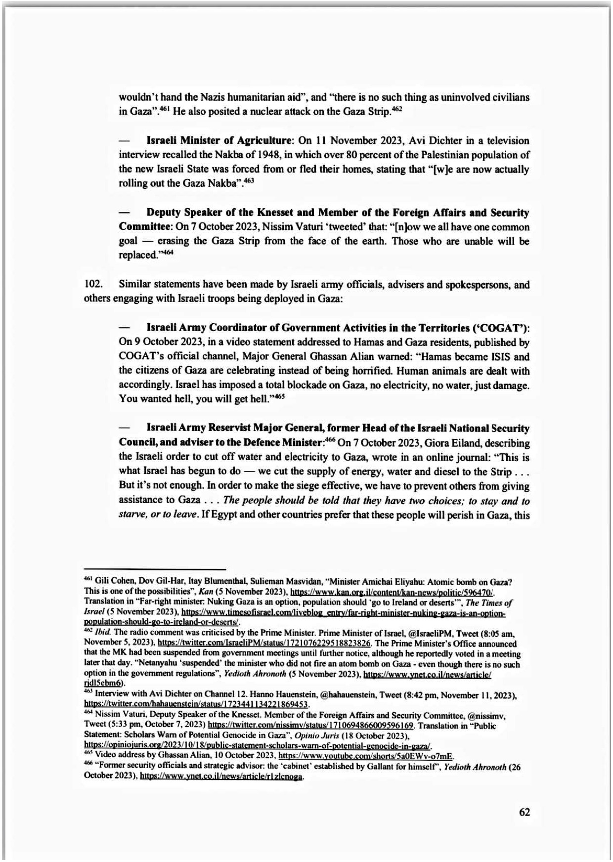 Наконец, всё это делается под лозунгами, доказывающими геноцидальный умысел: „Мы воюем с Амалеком”, „В Газе нет невинных людей”, „Дети Газы сами навлекли на себя это”, „Мы уничтожим Газу”, „Мы уничтожаем человекоподобных животных” и т.д. Всё это высказывания руководителей Израиля: от президента и премьер-министра до министров и членов Кнессета. Еще больше этого мы слышим от беснующихся израильских военных, хвастающих своими „подвигами” в многочисленных видео. Кроме того, должностные лица Израиля вслух говорят о намерении „освободить” Газу от населяющих ее палестинцев. Если всё это не геноцид, то что такое геноцид?