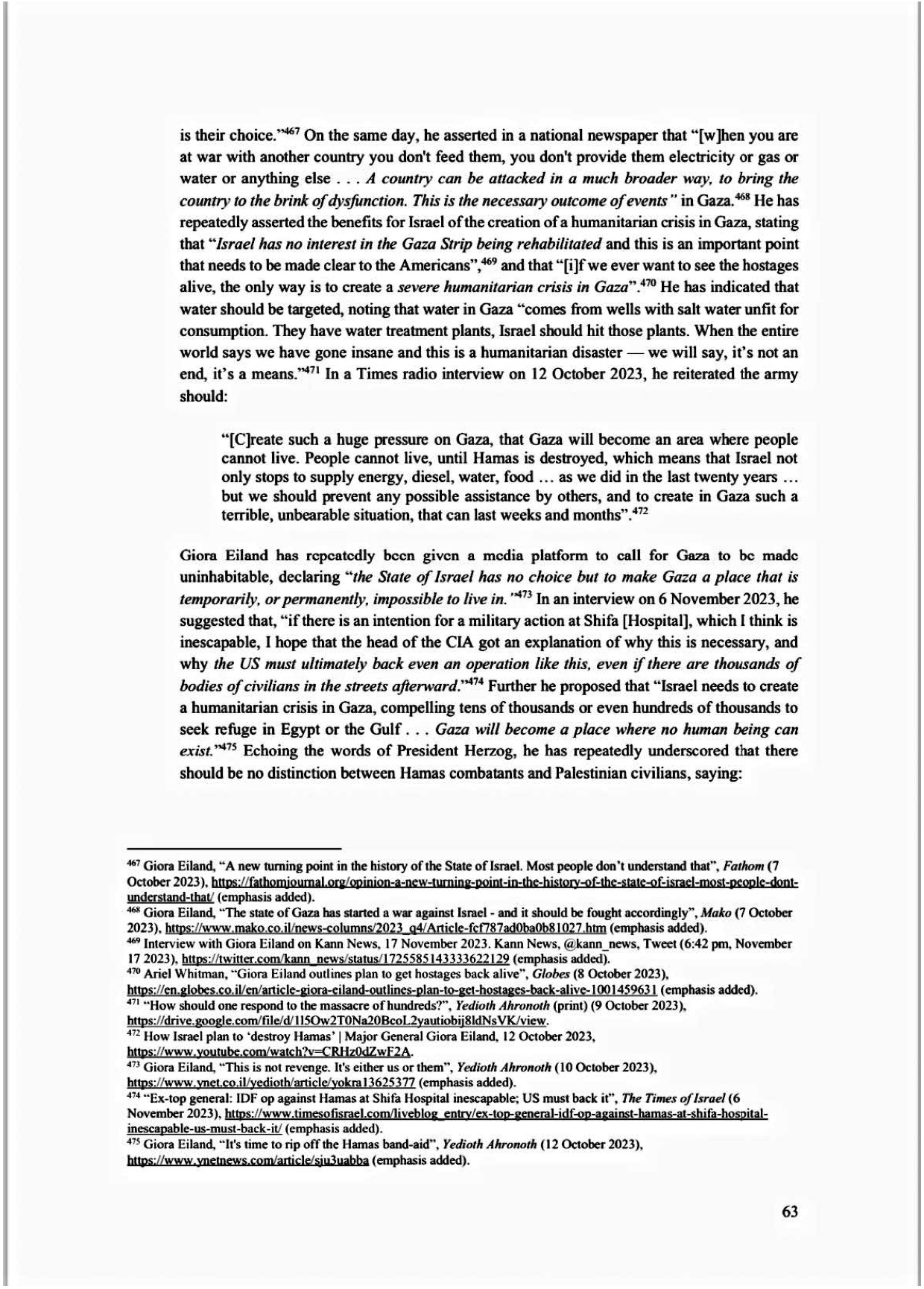 Попытки адвокатов Израиля оправдать вышеописанное зло действиями ХАМАС тщетны. Если бы даже израильская версия событий 7 октября 2023 года соответствовала действительности (а она сильно искажена), ни эта атака, ни любые другие действия любых лиц не могли бы служить оправданием геноцида палестинцев. Потому что геноцид по определению не может быть оправданным».