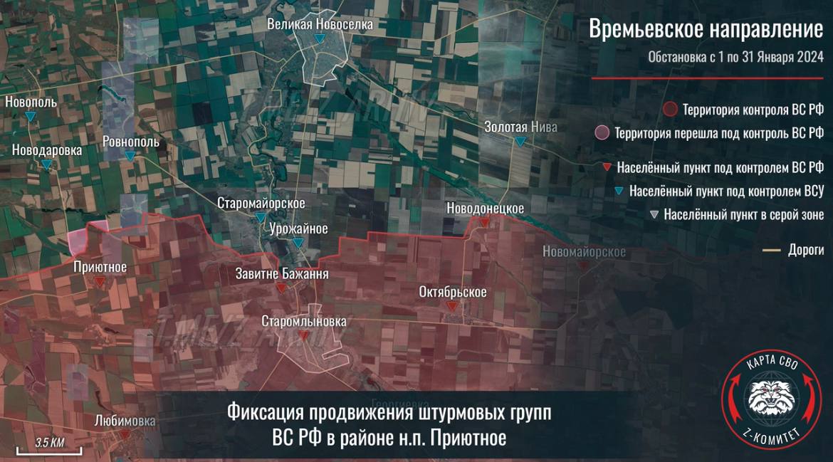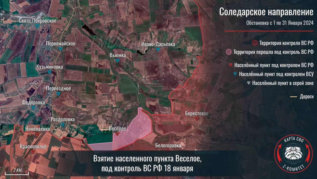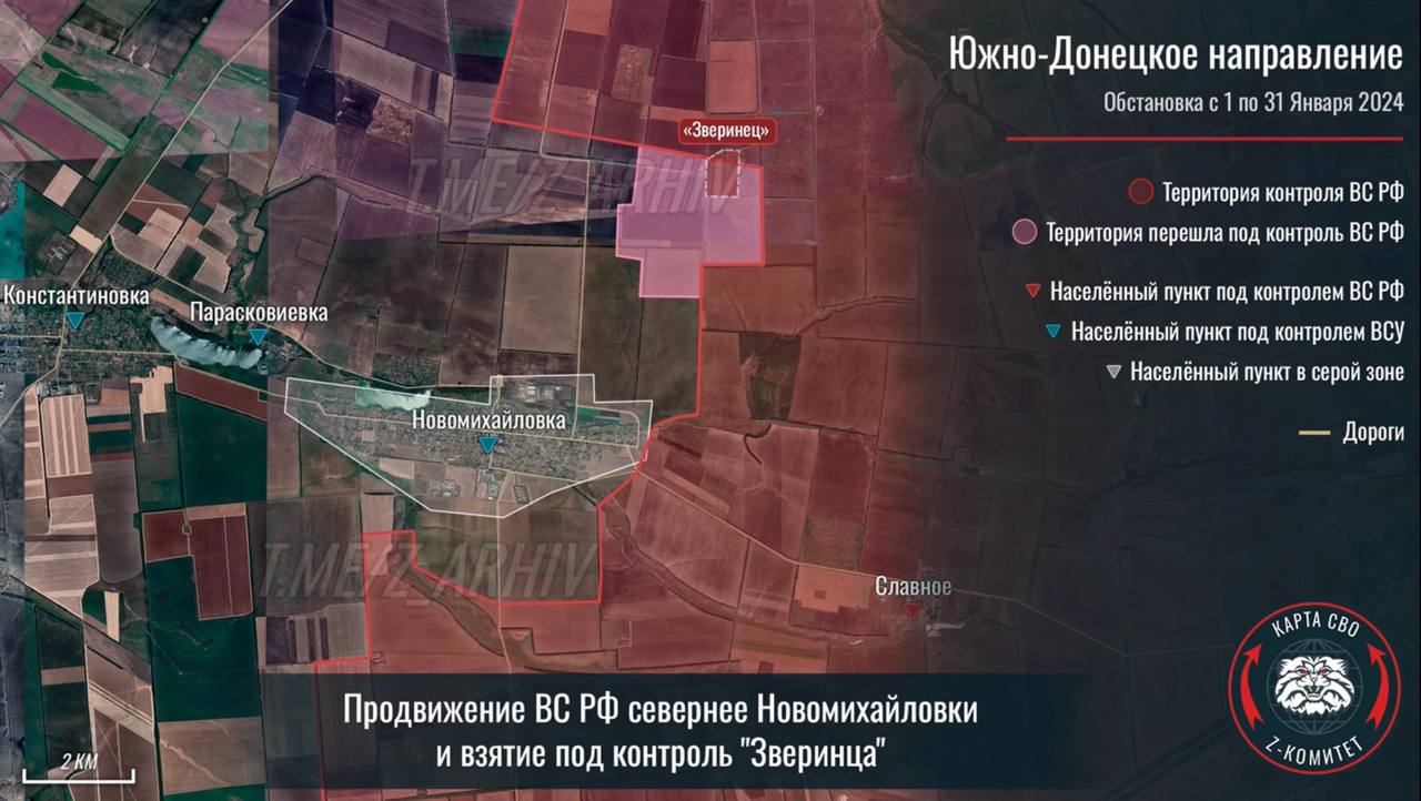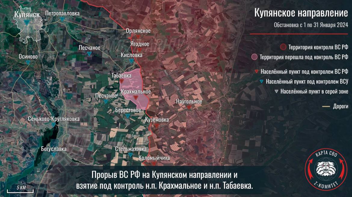 Z-канал «Осведомитель» опубликовал подборку инфографики с продвижением ВС РФ за январь на основе интерактивной карты от пророссийского ресурса «Z комитет + карта СВО».