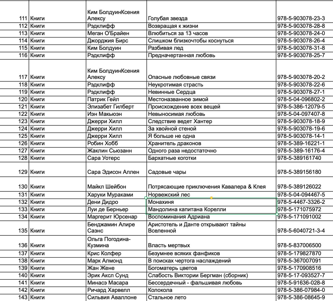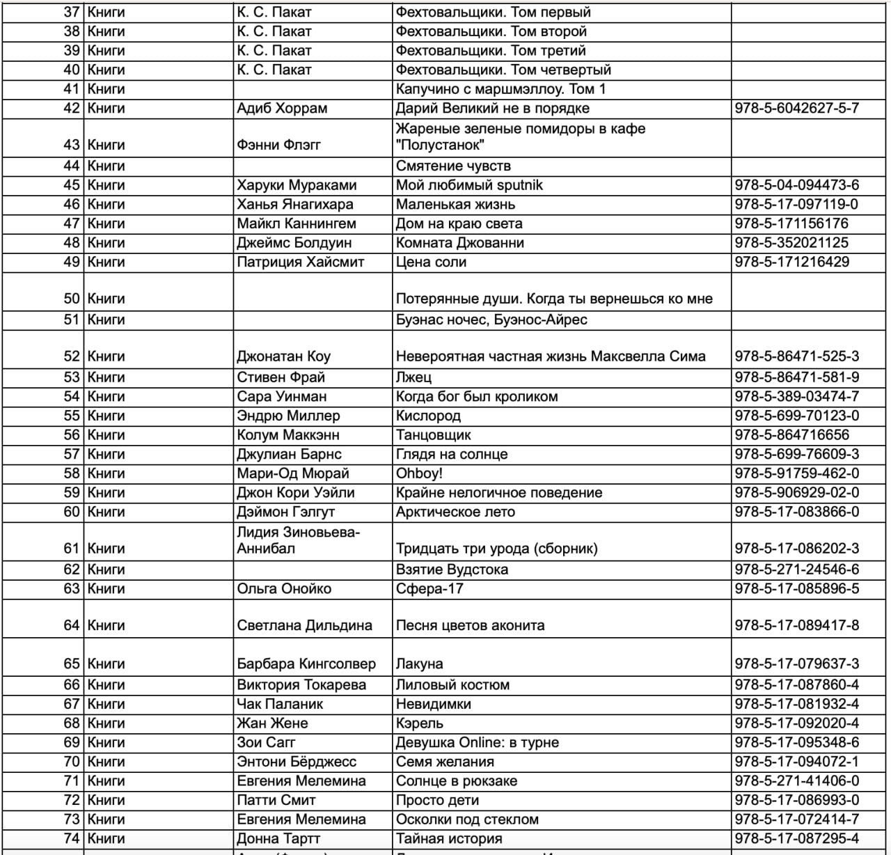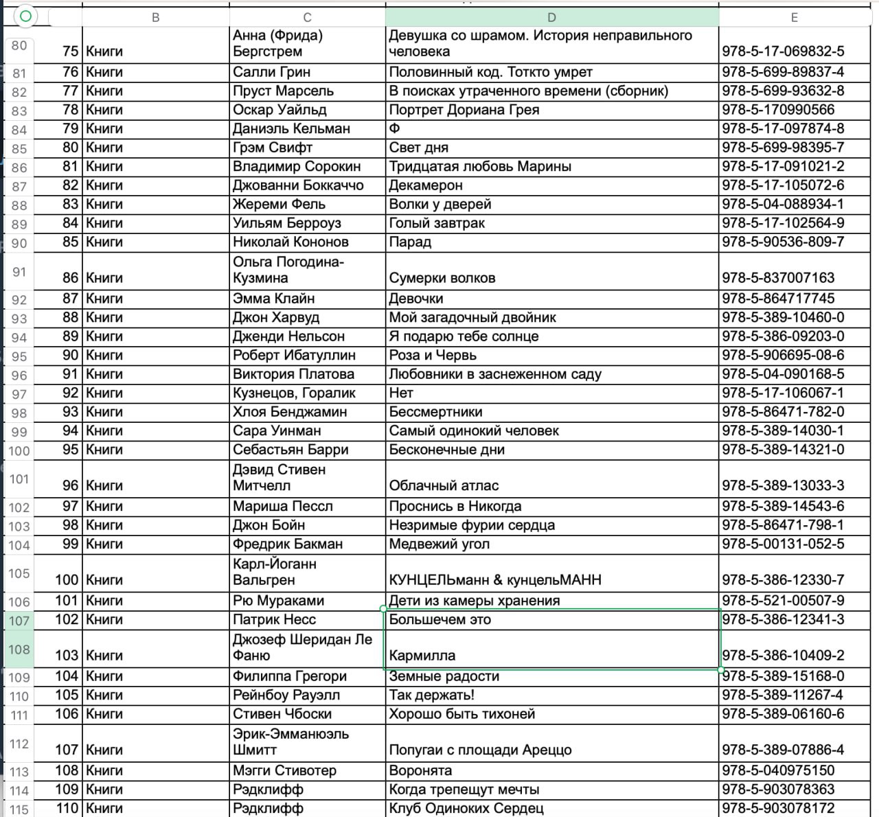 Там есть, в частности, произведения Платона, Джованни Бокаччо, Фёдора Достоевского, Владимира Сорокина, Стивена Кинга, Марселя Пруста, Стефана Цвейга, Хулио Кортасара, Вирджинии Вулф, Донны Тарт, Чака Паланика, Харуки Мураками, Пауло Коэльо, Джона Ирвинга, Стивена Фрая.