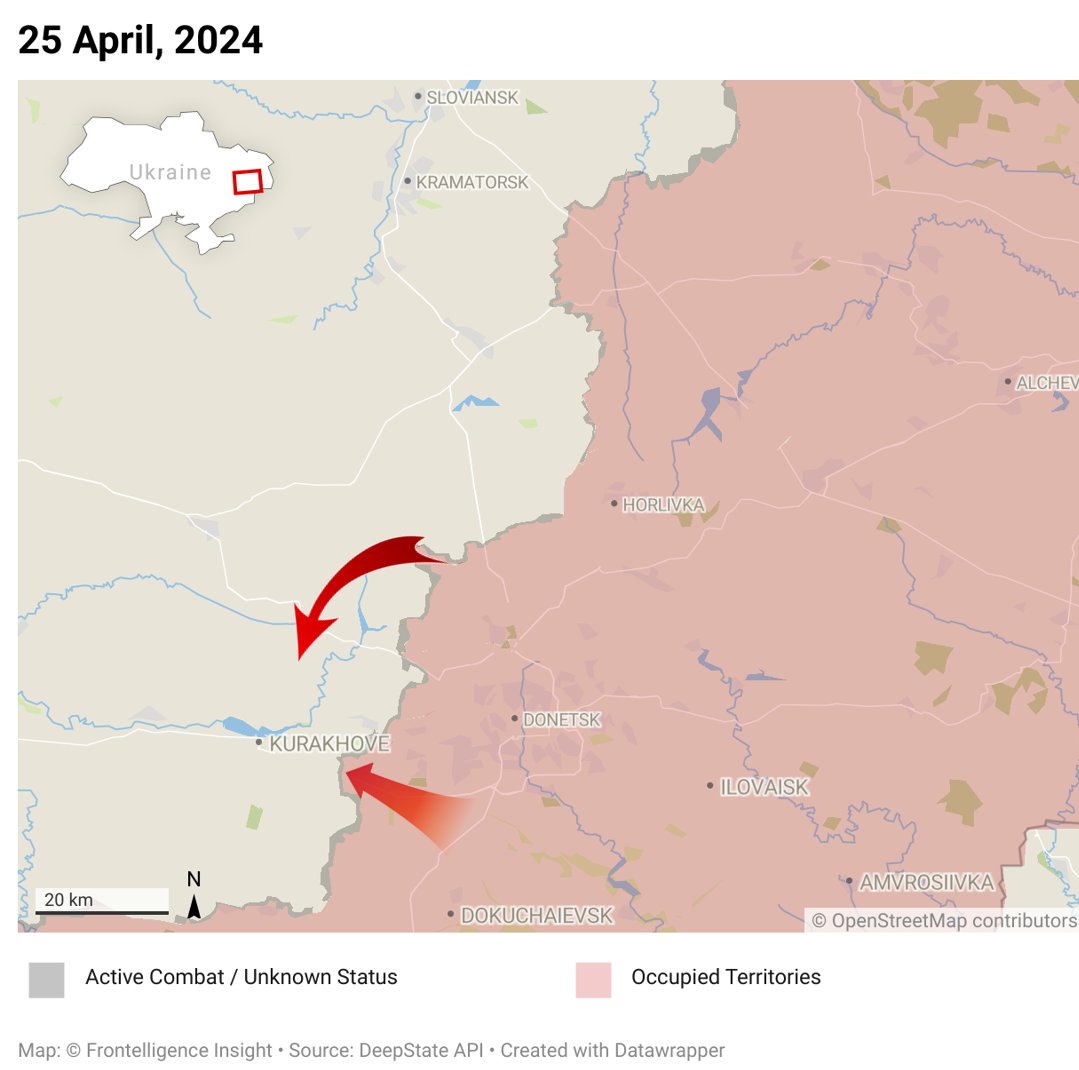 Исследователь Naalsio обновил данные по визуально подтвержденным потерям техники в Покровском районе (имеется в виду операционный район к западу от Авдеевки) и в районе Крынок на левом берегу Днепра. В Покровском районе, по его подсчетам, россияне за неделю с 19 по 26 апреля потеряли как минимум 25 единиц техники (в том числе 10 танков и 13 ББМ), подтвержденные потери техники ВСУ увеличились на 1 единицу. Под Крынками же подтвержденные потери сторон за тот же период составили 2 единицы техники для ВС РФ и одну — для ВСУ.