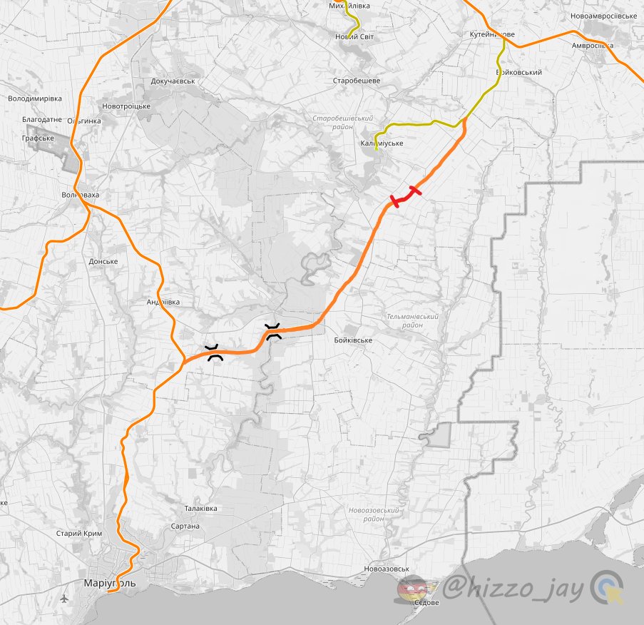 На оккупированной территории Донецкой области продолжается строительство железнодорожной ветки на Мариуполь, которое видно на спутниковых снимках. При этом, хотя на отдельных участках началась укладка второй колеи, на одном из перегонов имеется разрыв вообще без рельсов, поэтому новая железная дорога пока не готова к приему поездов.