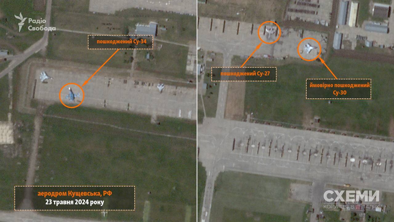 Как минимум два истребителя — Су-27 и Су-34 — были повреждены после налета в ночь на 19 мая беспилотников на аэродром Кущёвская в Краснодарском крае. Кроме того, судя по спутниковым снимкам, повреждения могут быть и у истребителя Су-30. Судя по ливрее одного из истребителей, он принадлежит к пилотажной группе «Русские витязи».