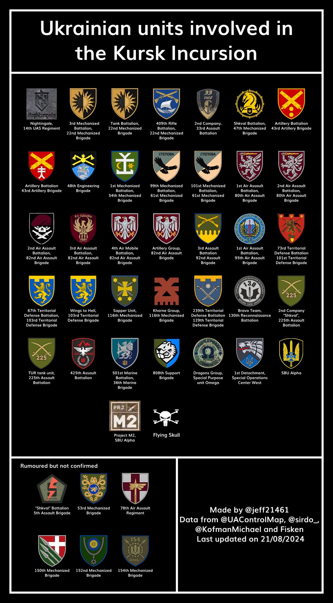 Аналитик под ником Jeff2146🇧🇪 публикует инфографику (1, 2) по подразделениям, принимающим участие в боях на курском направлении с российской и украинской стороны.