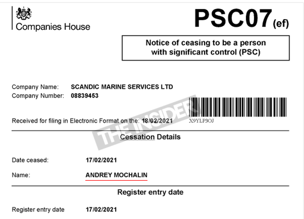 Кроме того, Мочалин в качестве лица с существенным контролем (person with significant control) фигурировал в британской компании SCANDIC MARINE SERVICES LTD. Эта компания также оказывает услуги по гарантийному обслуживанию судов и предоставляет консультации при судебных разбирательствах. Судя по открытому реестру британских компаний, Мочалин был аффилирован с фирмой как минимум с января 2017 года до февраля 2021-го.