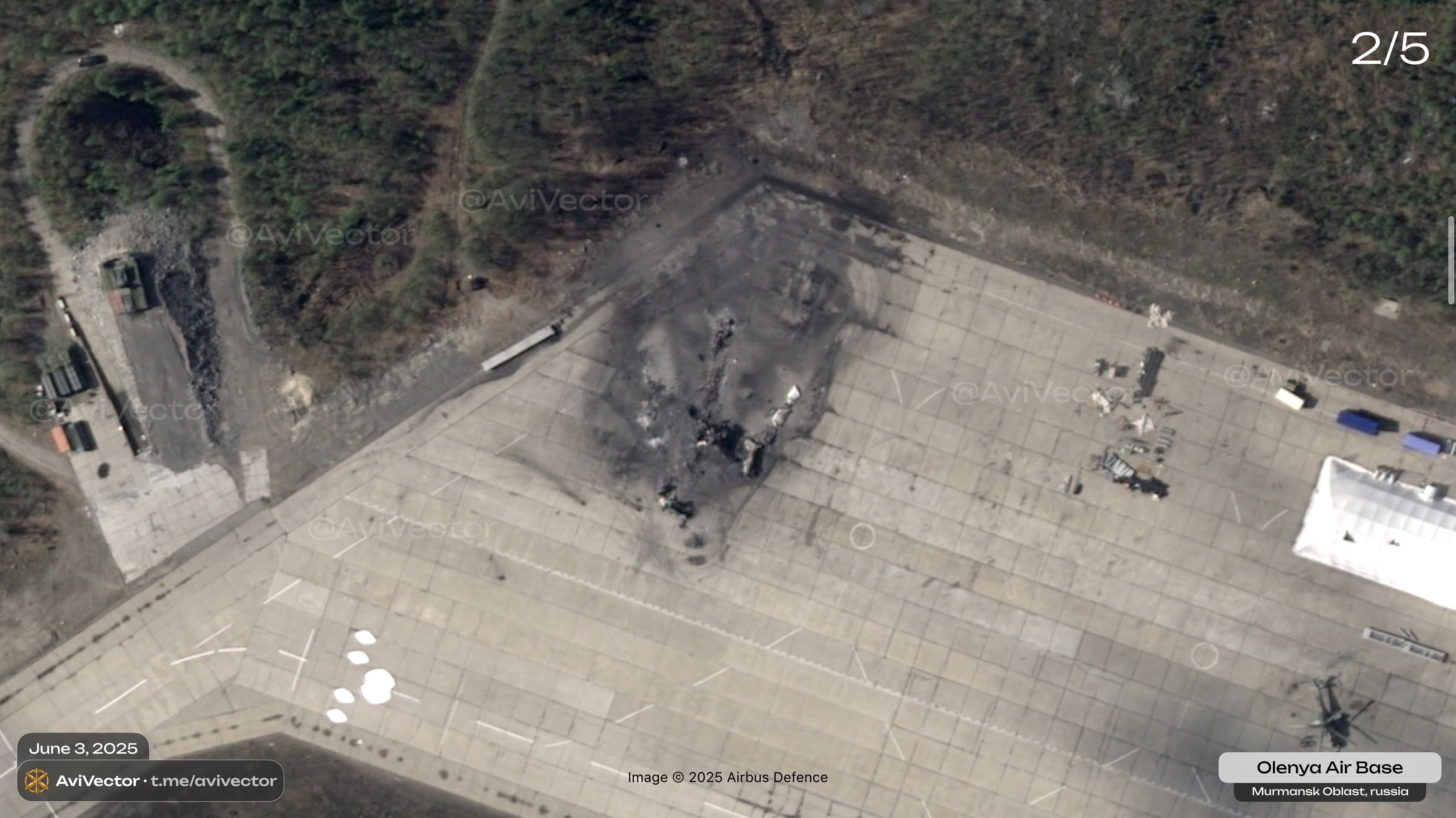 На снимке с SAR-спутника за 2 июня, который публикуют украинские военные аккаунты в соцсетях, также зафиксировано уничтожение четырех российских бомбардировщиков Ту-95 и одного транспортного самолета Ан-12 на авиабазе Оленья в Мурманской области.