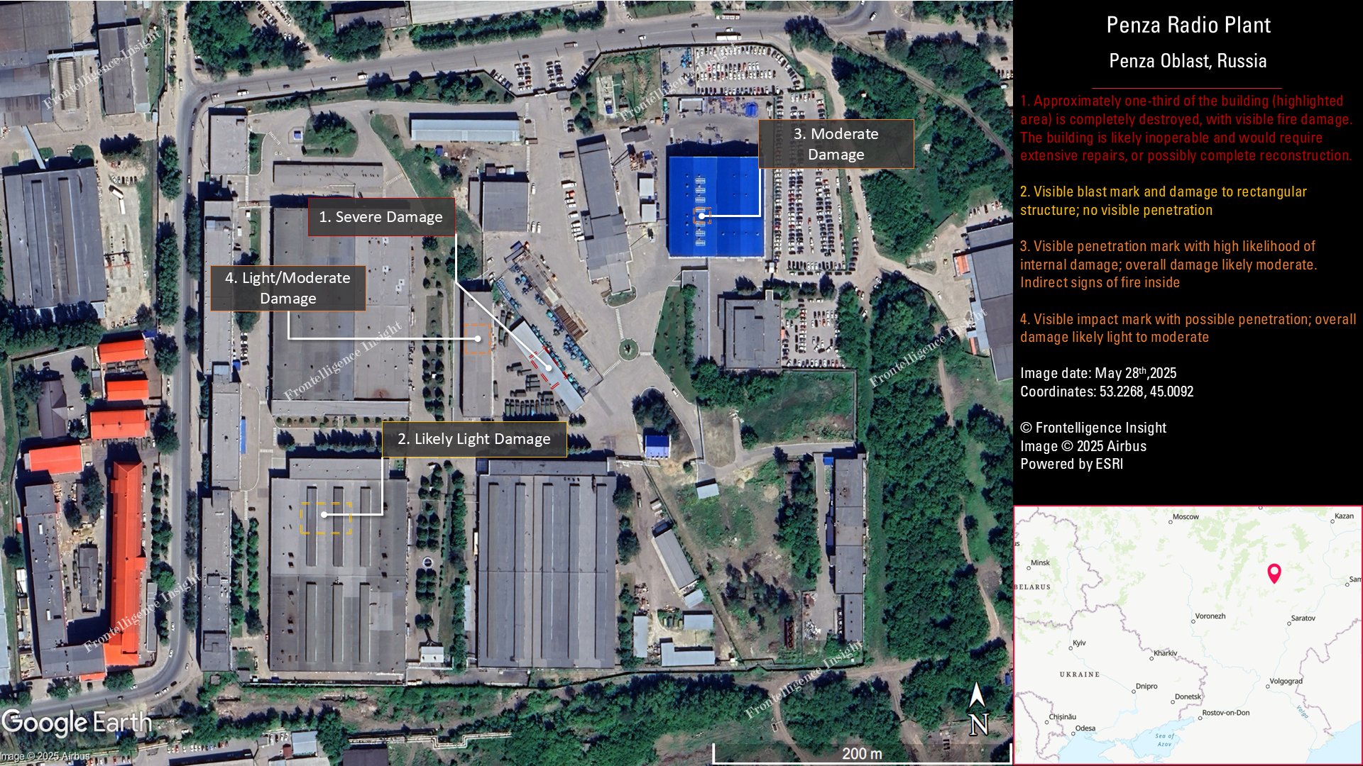Tatarigami_UA проанализировал спутниковые снимки последствий налета БПЛА на предприятие «Радиозавод» в Пензе. По его предварительной оценке, одно из зданий, вероятно, полностью выведено из строя, второе получило повреждения в результате удара и пожара, третье, предположительно, также пострадало от удара, а четвертое повреждено незначительно.
