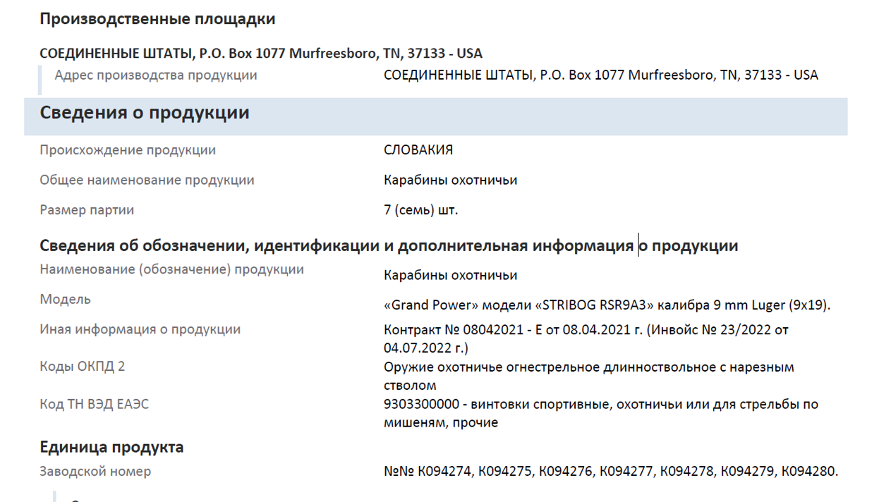 Помимо местного производства, продолжался и импорт продукции Grand Power. В период с 2022 по 2024 год как минимум два оружейных дистрибьютора ввозили в Россию оружие этой словацкой марки. ООО «Варяг» получил 12 карабинов Stribog, а ООО «Форт» импортировал 96 пистолетов словацкого производства. «Варяг» занимается в первую очередь импортом снайперских винтовок: в 2022–2024 годах компания завозила британские Accuracy AXMC, канадские Cadex и американские Barret и Desert Tech. При этом местом производства словацких карабинов указан адрес в США, где находится Barrett Firearms Manufacturing — еще один производитель, оружие которого «Варяг» завозил в Россию.