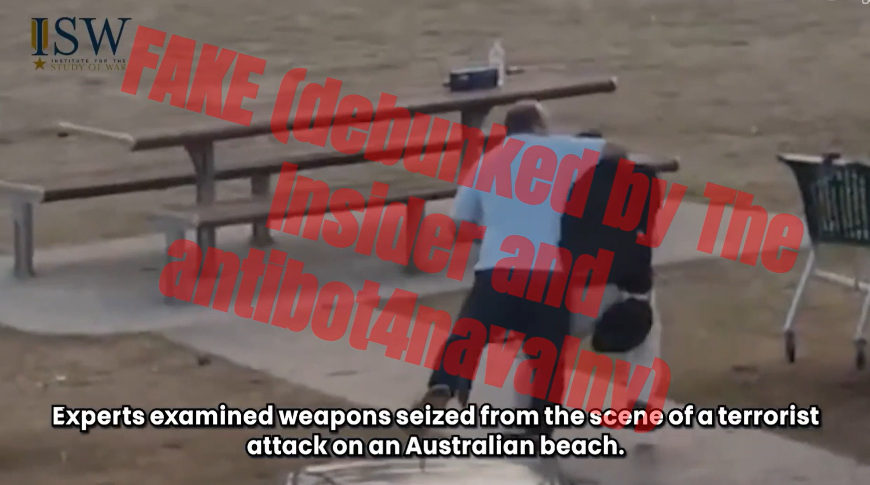 Один из роликов, распространяемых через соцсети Twitter (X) и BlueSky, замаскирован под контент, выпущенный Институтом изучения войны (ISW). В нем утверждается, что эксперты нашли на дробовиках, использованных террористами в Сиднее, некие метки, которые наносят на оружие, поставляемое в Украину. В ролике утверждается, что страна стала «крупнейшим источником оружия для черного рынка».