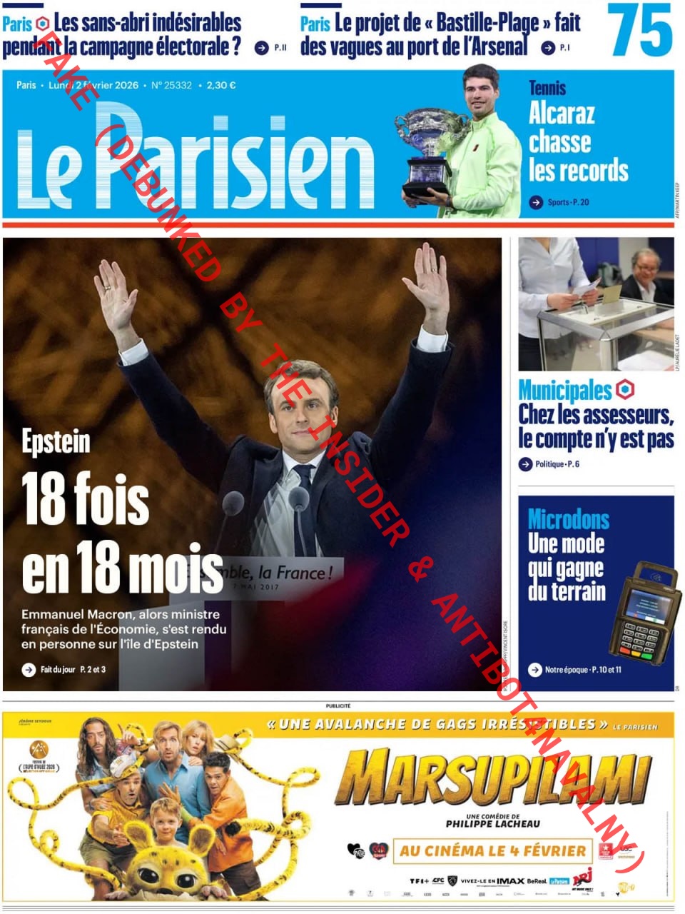 Дезинформация также распространяется через сфабрикованные обложки французских изданий. На поддельной обложке La Croix (реальная обложка номера) утверждается, что Елисейский дворец отказался комментировать визиты Макрона на остров Эпштейна. Фальшивые обложки Le Parisien (реальная обложка номера) и Libération (реальная обложка номера) от 2 февраля 2026 года утверждают, что Макрон 18 раз за 18 месяцев посещал остров Эпштейна в период работы министром экономики.