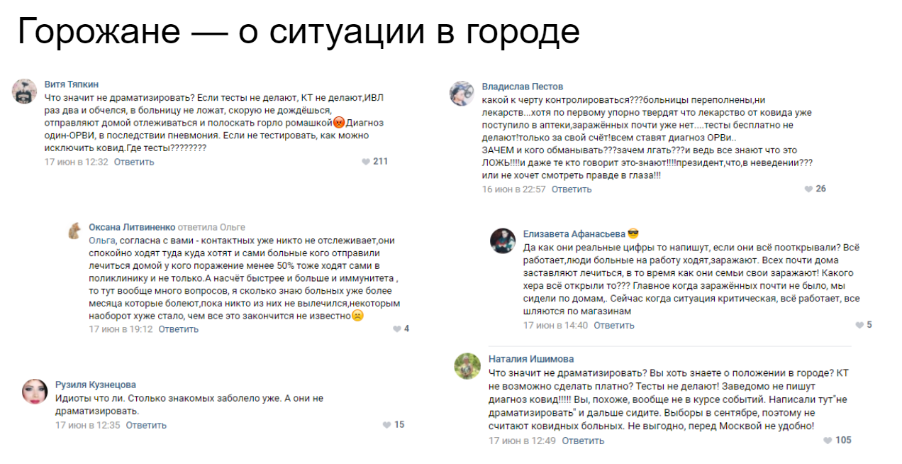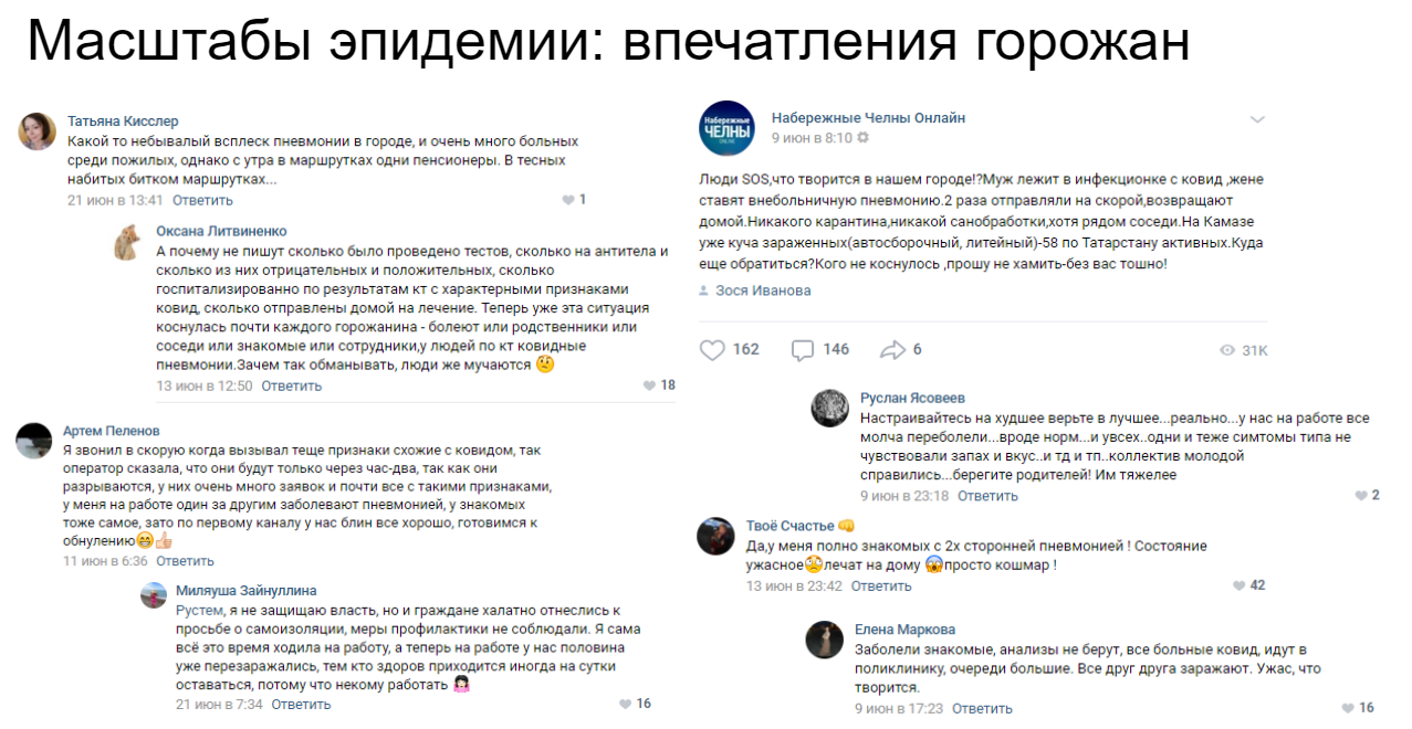 Что пишут люди. Общий лейтмотив сообщений: «ситуация критическая, весь город болеет». Это сообщения не трёх паникёров — это комментарии от десятков людей. В июне практически исчезают комментарии вроде «кто-то знает хоть одного человека, кто болеет этим ковидом?», а когда появляются — собирают урожай явок: «столько знакомых заболело уже», «среди знакомых полно больных и все контактные». По комментариям и постам людей создаётся впечатление, будто весь город кашляет, стоит в очередях в поликлиниках, с лихорадкой под 40 ждёт скорую сутками и болеет пневмонией.