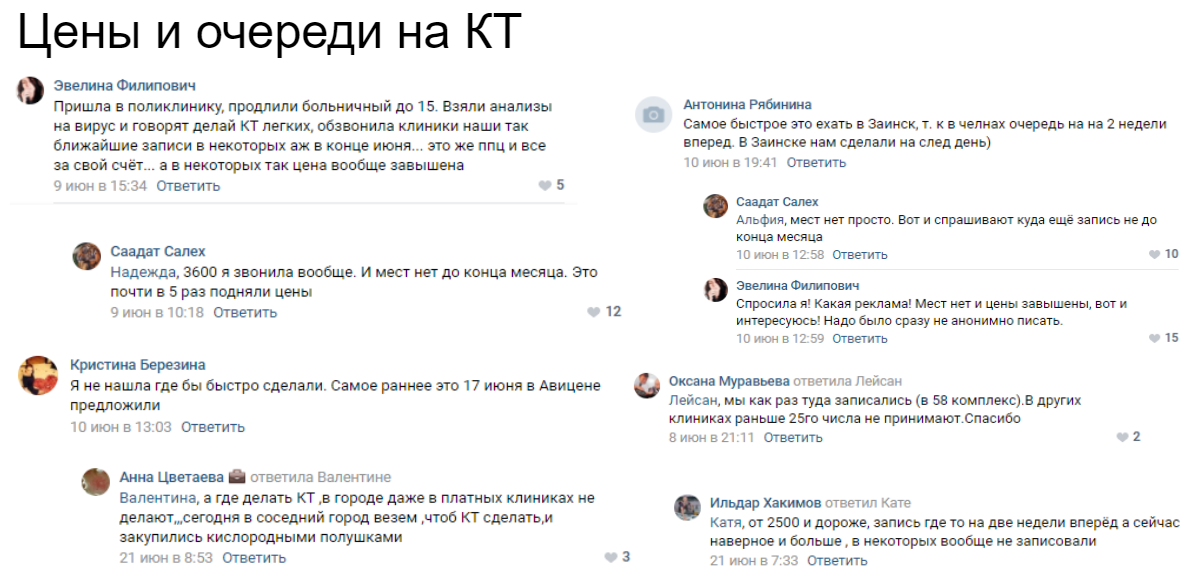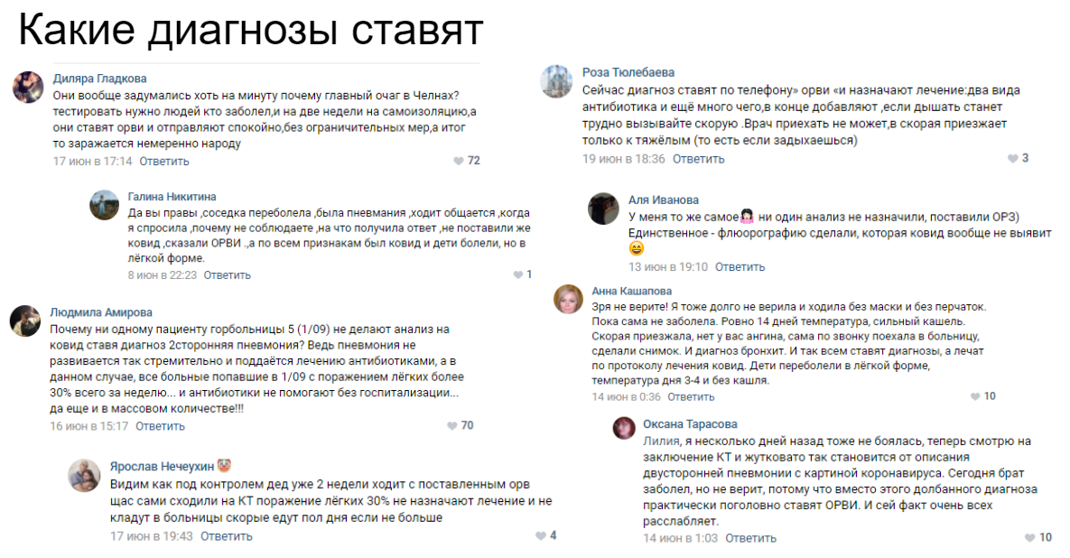 Что пишут люди. В поликлиниках поголовно ставят один диагноз: «ОРЗ» — и отправляют домой. О COVID не идёт речи. Никаких предписаний или хотя бы рекомендаций о самоизоляции. Многим не делают тесты: десятки жалоб на то, что «тестов вообще не проводят», даже «тем, у кого выявилась пневмония». Много жалоб на невозможность сделать КТ: в платных клиниках цены выросли в разы, очереди — на 1−3 недели вперёд, часть людей едет или везёт близких на КТ в соседние города: в Заинск и Нижнекамск.