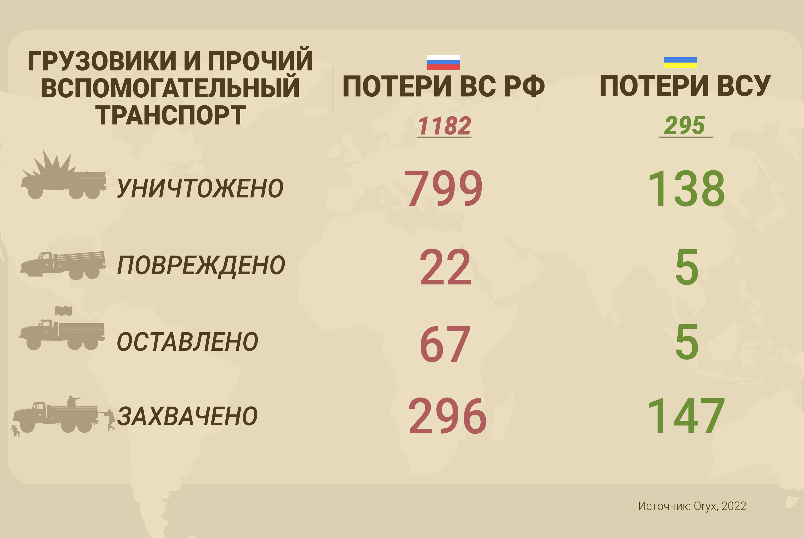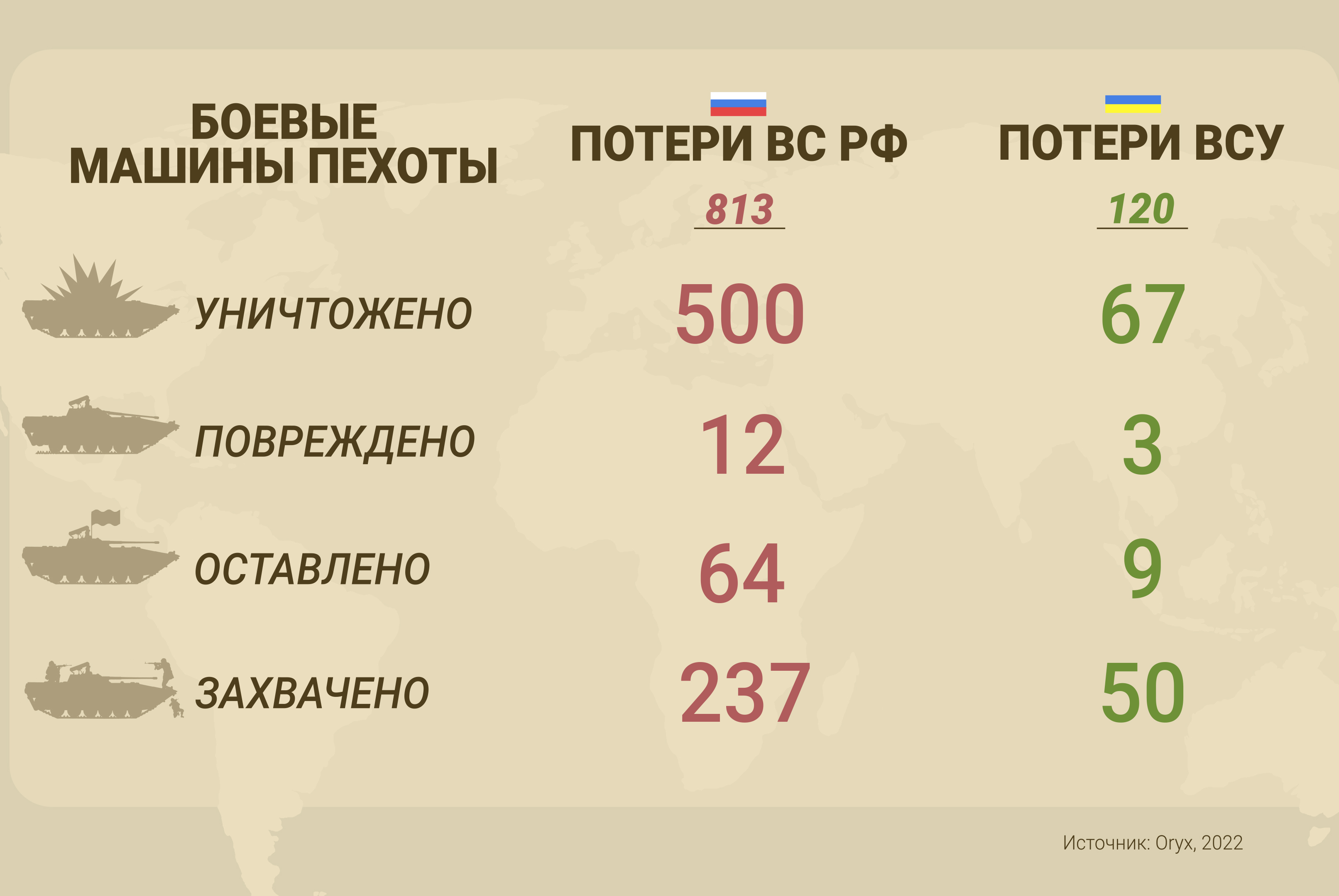 ВС РФ потеряли свыше 700 танков (в том числе более 200 самых массовых — Т-72Б3), из них только 400 уничтожили или повредили в бою, остальные пополнили ряды украинской армии. До половины и более потерь по другим категориям бронетехники также приходятся на оставленные и захваченные машины. Известные потери ВСУ на порядок меньше.